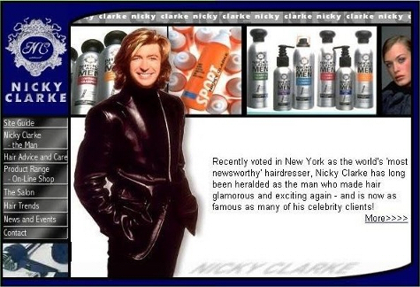 Nicky Clarke OBE I registered his domain name and designed the first web pages for this world famous celebrity hairdresser. Above you can see our original design. Nicky Clarke is an English hair stylist and media personality, who owns well known hair salons. He initially became famous for styling the hair of various celebrities on several television shows, before earning fame in his own right.